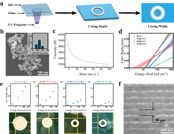 圖2. (a)測(cè)試固化厚度和固化寬度的實(shí)驗(yàn)示意圖;(b)陶瓷粉末的SEM圖像和粒度分布(插圖);(c)固含量為50 Vol.%的可打印陶瓷的流變行為;(d)不同濃度甲基橙油墨的固化深度與紫外線輻射劑量的關(guān)系;(e)不同濃度甲基橙油墨的固化寬度與紫外線輻射劑量的關(guān)系,下面的照片對(duì)應(yīng)的是不同濃度甲基橙油墨的固化情況;(f)三維打印綠色體層結(jié)構(gòu)。