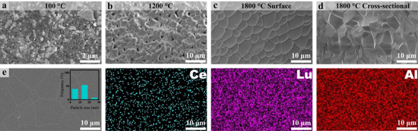 圖3. (a)印刷體在100 °C下干燥、(b)1200 °C下預(yù)燒結(jié)、(c)1800°C下真空燒結(jié)和(d)真空燒結(jié)后橫截面熱處理過(guò)程中的微觀結(jié)構(gòu)演變。(e)經(jīng)過(guò)拋光和元素圖譜繪制后的熱蝕刻透明陶瓷表面。