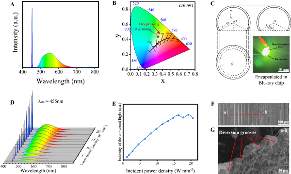 科研人員開(kāi)發(fā)了用于DLP的光固化陶瓷墨水,用于制造具有高印刷分辨率的激光驅(qū)動(dòng)照明鈰活化镥鋁石榴石(LuAG:Ce)發(fā)光透明陶瓷組件。用于DLP印刷的墨水,具有高達(dá)50 vol%的固含量和優(yōu)異的剪切稀化性能。研究在DLP墨水中引入了發(fā)光染料,以減少陶瓷粉末對(duì)紫外線的散射所產(chǎn)生的過(guò)量固化寬度效應(yīng)。研究利用DLP三維打印方法,制造出具有可定制的厘米級(jí)復(fù)雜三維幾何形狀的LuAG:Ce陶瓷坯體。經(jīng)過(guò)燒結(jié)工藝后,3D打印陶瓷組件的相對(duì)密度達(dá)到96.4%,并展現(xiàn)出優(yōu)秀的透光率(約 40%)。激光激發(fā)實(shí)驗(yàn)證實(shí),三維打印的LuAG:Ce透明陶瓷具有很高的激光通量閾值(19.22 W mm-2),這與其表面獨(dú)特的微通道結(jié)構(gòu)有關(guān)。實(shí)驗(yàn)表明,具有自由幾何結(jié)構(gòu)設(shè)計(jì)和高激光通量閾值的LuAG:Ce LTCs三維打印技術(shù)的應(yīng)用,為大功率激光驅(qū)動(dòng)照明提供了更高效、更可靠的解決方案。