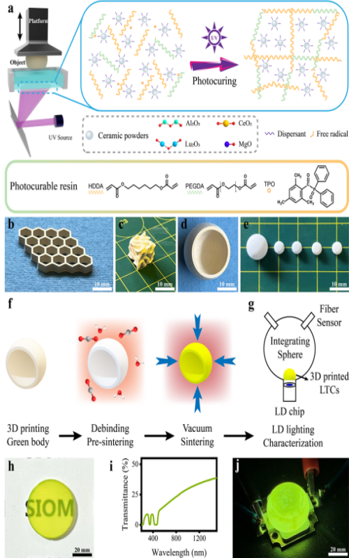 圖1. (a)DLP三維打印透明陶瓷坯體示意圖;打印的LuAG:Ce陶瓷坯體照片:(b)蜂窩、(c)最小表面、(d)超半球和(e)不同尺寸的超半球。(f)3D打印LTC的燒結(jié)過(guò)程示意圖;(g)激光照明裝置;(h) 日光下放置在 "SIOM "字母上的拋光后3D打印 LTC;(i)透光率光譜;(j)封裝在LD照明芯片中的燒結(jié)超半球3D打印LTC。