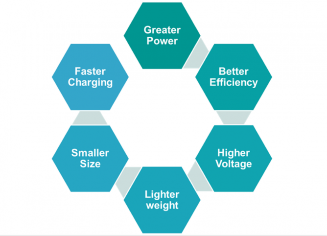 與硅相比,碳化硅在材料特性方面具有多種優(yōu)勢,因而成為主驅(qū)逆變器設(shè)計的更優(yōu)選擇。首先是它的物理硬度,達到了 9.5 莫氏硬度,而硅為 6.5 莫氏硬度,所以碳化硅更適合高壓燒結(jié)并具有更高的機械完整性。再者,碳化硅的熱導(dǎo)率 (4.9W/cm.K) 是硅 (1.15 W/cm.K) 的四倍多,這意味著它可以更有效地傳遞熱量從而在更高溫度下可靠運行。最后,碳化硅的擊穿電壓(2500kV/cm)是硅(300kV/cm)的 8 倍多,而且它具有寬帶隙性質(zhì),能夠更快地導(dǎo)通和關(guān)斷,因而成為電動汽車日益升高的電壓 (800V) 架構(gòu)的更優(yōu)選擇,同時更寬的帶隙電壓意味著它的損耗比硅更低。