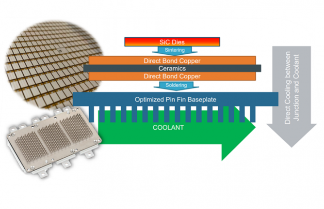 采用先進互連技術(shù)的壓鑄模封裝進一步提高了 SiC 模塊的高功率密度,并且具有低雜散電感(對于高速開關(guān)效率非常重要),而且更高的開關(guān)頻率有助于減小系統(tǒng)中一些無源組件的尺寸和重量。此外,這種封裝類型具有多種工作溫度選項(最高達 200°C),可降低 OEM 的散熱要求,并有望采用更小的泵進行熱管理。