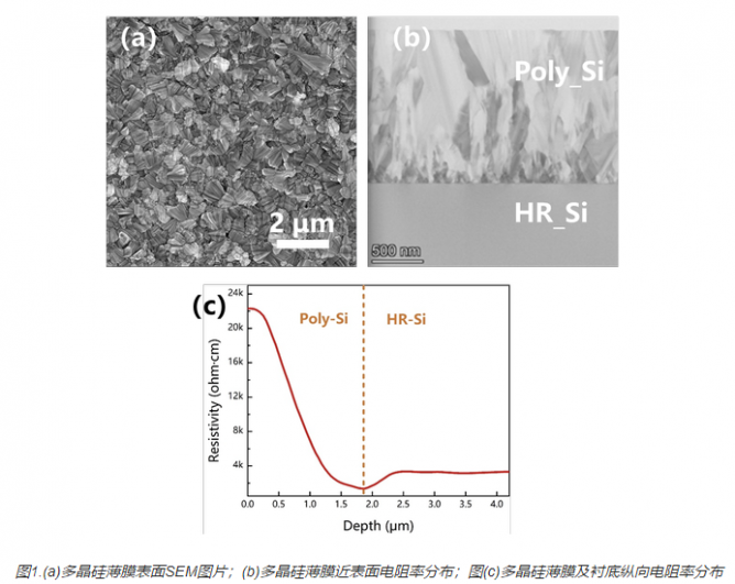 多晶硅層用作電荷俘獲層是RF-SOI中提高器件射頻性能的關(guān)鍵技術(shù),晶粒大小、取向、晶界分布、多晶硅電阻率等參數(shù)與電荷俘獲性能有密切的關(guān)系;此外,由于多晶硅/硅的復(fù)合結(jié)構(gòu),使得硅晶圓應(yīng)力極難控制。團隊為制造適用于300 mm RF-SOI晶圓的多晶硅層找到了合適的工藝窗口,實現(xiàn)了多晶硅層厚度、晶粒尺寸、晶向和應(yīng)力的人工調(diào)節(jié),相關(guān)成果發(fā)表于《Semiconductor Science and Technology》(38,095002,2023)、《ECS Journal of Solid State Science and Technology》(7,P35-P37,2018)、《Chinese Physics Letters》(34,068101,2017;35,047302,2018)等期刊上。圖1(a)展示了沉積的多晶硅薄膜表面SEM圖像;圖1(b)展示了多晶硅剖面TEM結(jié)構(gòu);圖1(c)為多晶硅薄膜及襯底縱向電阻率分布。