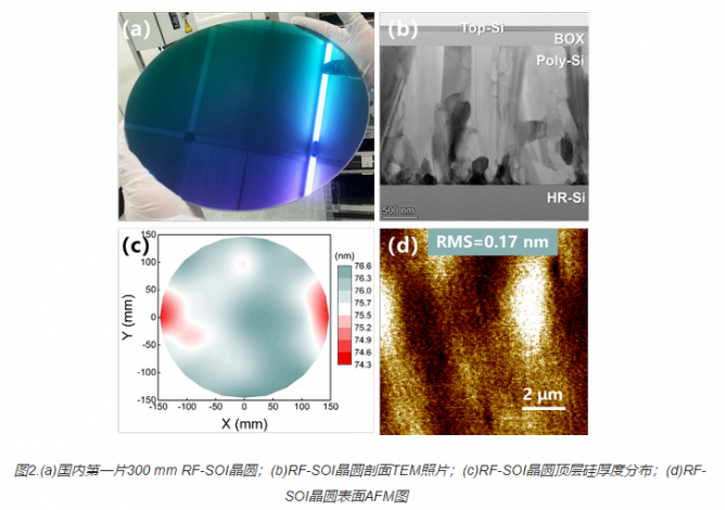 在300 mm RF-SOI晶圓制備過程中,自主開發(fā)了基于高溫?zé)崽幚淼姆墙佑|式平坦化工藝,實現(xiàn)了SOI晶圓原子級表面平坦化。圖2(a)展示了團隊研制的國內(nèi)第一片300 mm RF-SOI晶圓;圖2(b)為RF-SOI晶圓剖面TEM照片,其擁有含多晶硅電荷俘獲層在內(nèi)的四層結(jié)構(gòu);圖2(c)所示,最終RF-SOI晶圓頂層硅厚度中心值為75nm;圖2(d)所示,RF-SOI晶圓表面粗糙度小于0.2 nm。