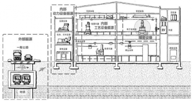 電子工業(yè)廠房的主要振源可劃分為外部和內部。如下圖所示,外部振源主要是指存在于廠房外部的環(huán)境微振動,例如:公路交通及軌道交通等。而內部振源根據(jù)所在位置及功能可分為兩類,一類是保障生產(chǎn)運行的動力設備振源,如空調風機、供水排水泵等;另一類則是精密設備自身攜帶的工藝設備振源,如檢查設備、搬運設備等。上述各類型振源都可能對生產(chǎn)安全和生產(chǎn)質量造成影響,因此對電子工業(yè)廠房設計、施工以及運營過程中均應掌握廠房的微振動情況,并及時采取相應的解決措施。