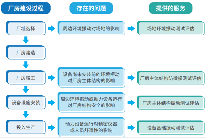 有防微振要求的工廠環(huán)境振動測試一般分為四個階段,針對各個階段不同的振動影響,本公司可以提供相應的振動測試服務,如下圖所示: