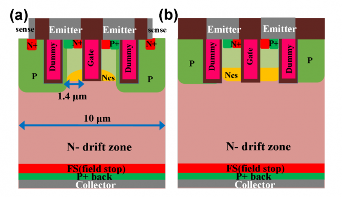 圖1:(a)提出的HP-CSTBT和(b)傳統(tǒng)CSTBT器件的結(jié)構(gòu)示意圖。