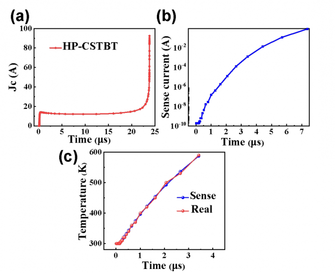 圖2:(a)短路特性。(b)短路過程傳感電流隨時(shí)間的變化。(c)器件實(shí)時(shí)最高溫度和傳感計(jì)算溫度。
