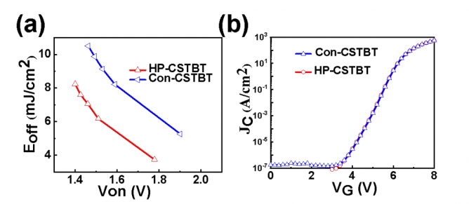 圖3:(a)HP-CSTBT和傳統(tǒng)CSTBT的VON和EOFF之間的權(quán)衡關(guān)系。(b) 傳統(tǒng)CSTBT和HP-CSTBT的轉(zhuǎn)移特性曲線。
