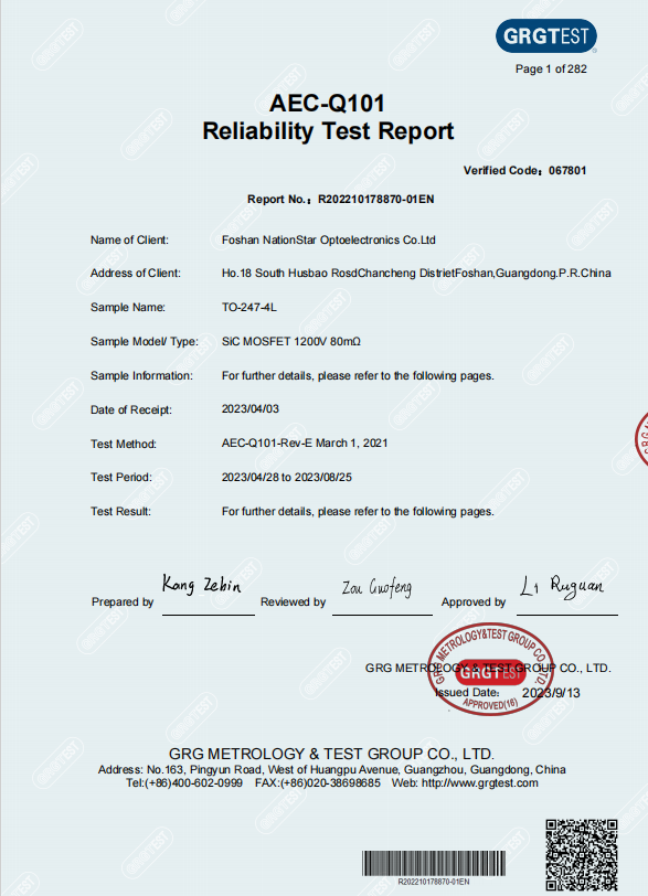 繼1200V/10A SiC-SBD(碳化硅-肖特基二極管)器件獲AEC-Q101車(chē)規(guī)級(jí)認(rèn)證后,近日,國(guó)星光電開(kāi)發(fā)的1200V/80mΩ SiC-MOSFET(碳化硅-場(chǎng)效應(yīng)管)器件也成功獲得了AEC-Q101車(chē)規(guī)級(jí)認(rèn)證并通過(guò)高壓960V H3TRB (HV-H3TRB)可靠性考核,使公司成為國(guó)內(nèi)少數(shù)SiC功率分立器件產(chǎn)品通過(guò)雙重考核的廠商之一。