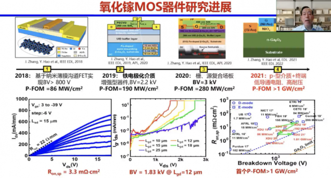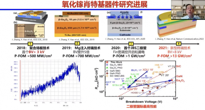 2018年以來(lái),在郝躍院士領(lǐng)導(dǎo)下,西安電子科技大學(xué)通過(guò)自主氧化鎵生長(zhǎng)MOCVD設(shè)備、高質(zhì)量氧化鎵外延材料、高壓器件新結(jié)構(gòu)與新工藝等一系列技術(shù)創(chuàng)新,實(shí)現(xiàn)了氧化鎵功率二極管和功率晶體管性能的高速提升,取得了多項(xiàng)里程碑成果,使我國(guó)氧化鎵功率器件研究水平進(jìn)入國(guó)際前列。