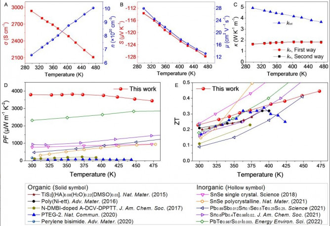2020年,在先前研究的基礎(chǔ)上,團(tuán)隊(duì)設(shè)計(jì)制備了一種n型電荷轉(zhuǎn)移配合物(Br-C6H4-NH2)2CuBr2。這種材料具有高達(dá)3990S cm−1的室溫電導(dǎo)率,大于1589 μW m?1K?2的功率因子,這是論文發(fā)表時(shí)有機(jī)熱電材料功率因子的最高值(圖1);最高熱電優(yōu)值達(dá)0.27。此外,在空氣中儲(chǔ)存109天后,(Br-C6H4-NH2)2CuBr2膜保留了原始電導(dǎo)率的87.8%,這是論文發(fā)表時(shí)n型有機(jī)熱電材料的創(chuàng)紀(jì)錄值。更令人驚訝的是,這種物質(zhì)即使在純水中浸泡180天后想穩(wěn)定性仍然很好。研究表明,較高的功率因子主要源于超高的電導(dǎo)率,而電導(dǎo)率主要來自Br-C6H4-NH2到CuBr2的電子轉(zhuǎn)移n型自摻雜機(jī)理。2022年11月18日,該成果以《具有超高功率因子和高空氣穩(wěn)定性的n型金屬-有機(jī)電荷轉(zhuǎn)移配合物》(Giant Power Factor and High Air-Stability in n-Type metal-Organic Charge-Transfer Complex)為題發(fā)表在英國皇家化學(xué)會(huì)旗下《材料化學(xué)期刊·A》(Journal of Materials Chemistry A)上,并入選熱點(diǎn)論文(HOT Papers)。西安交通大學(xué)電子學(xué)院李小磊助理教授和材料學(xué)院博士生張高為本文共同第一作者,西安交通大學(xué)材料學(xué)院楊冠軍教授和清華大學(xué)萬春磊副教授為本文共同通訊作者。