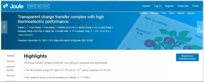 [3] Transparent charge transfer complex with high thermoelectric performance,Joule, 2023, 7, 1–16.https://doi.org/10.1016/j.joule.2023.10.008.