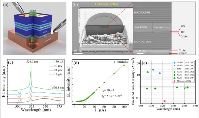 電注入GaN基VCSEL的 (a)結(jié)構(gòu)示意圖(b)FIB-SEM圖(c)電注入EL光譜(d)PI曲線; (e)國內(nèi)外GaN基綠光VCSEL閾值電流密度與波長的對應(yīng)關(guān)系圖