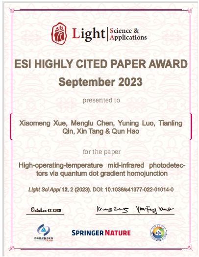 北京理工大學郝群教授團隊在室溫運行中波紅外探測器研究方面取得突破性的進展,相關(guān)論文于2023年1月發(fā)表于光學頂刊Light:Science & Applications,獲得封面論文。近日該論文入選ESI高被引。