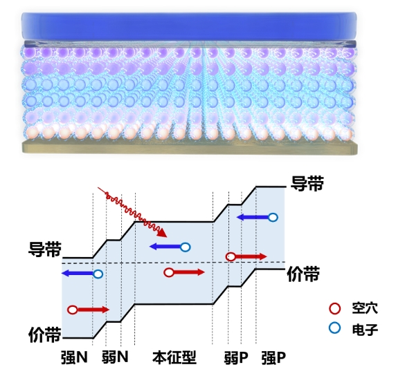 郝群教授團隊創(chuàng)新性的提出量子點表面偶極子摻雜方法,開發(fā)混相配體交換技術(shù),首次在紅外量子點領(lǐng)域提出并制備了“強P-弱P-本征-弱N-強N”梯度堆疊同質(zhì)結(jié)器件。該新型器件: