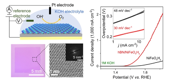 本工作選擇的二維六方氮化硼(hBN)材料,表面高密度B-N鍵易于形成電子局域活性中心,優(yōu)化OER反應中含氧物種的吸附。而且,盡管塊體hBN是絕緣體,但當其厚度降低到單原子層時,電荷可通過隧穿快速傳輸?;诖耍没瘜W氣相沉積法生長的厘米級單原子層hBN薄膜作為助催化劑,封裝NiFeOxHy陽極,器件表現(xiàn)出超低的塔菲爾斜率(~30 mV dec−1),OER電流密度比單獨NiFeOxHy提高10倍(490mV過電位下達~2 A cm−2),并且可以在~2A cm-2的高電流密度下穩(wěn)定運行超過150h。電極質量活性比商業(yè)化催化劑高出五個數(shù)量級。實驗和理論計算結果表明,OER性能的提升歸因于hBN助催化劑上含氧中間體的吸附,hBN/NiFeOxHy表面局域電子促進了含氧中間體的去質子化過程。同時,此類單原子層hBN助催化劑可適用于多種常用OER電催化劑表面的封裝,均可大幅提升電極性能。本工作發(fā)展了利用單原子層二維材料作為助催化劑的新方法,為深入理解電極表界面原子層反應機理以及精準調控機制提供了新的思路。