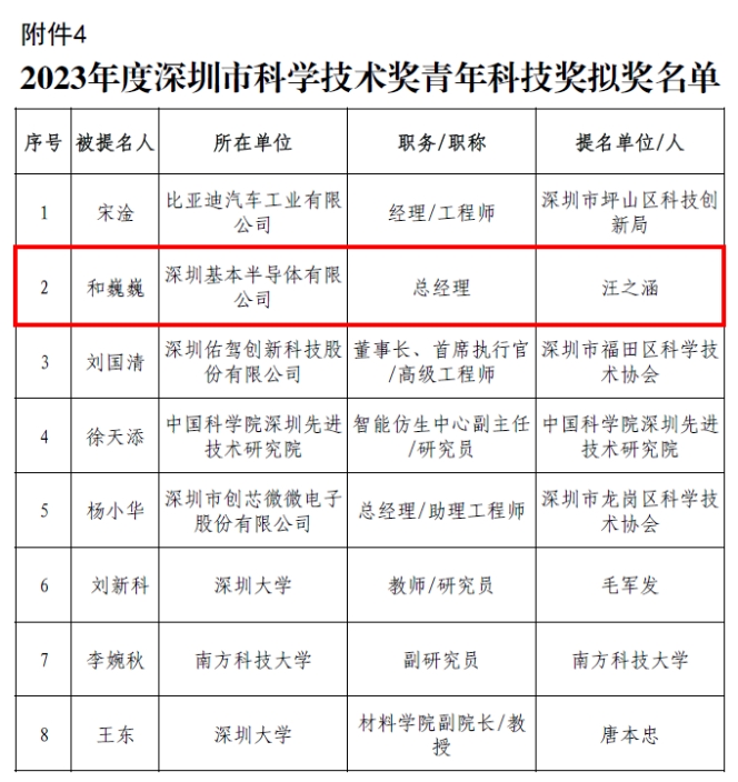 日前,深圳市科學(xué)技術(shù)獎(jiǎng)勵(lì)委員會(huì)公示了2023年度深圳市科學(xué)技術(shù)獎(jiǎng)擬獎(jiǎng)名單,基本半導(dǎo)體總經(jīng)理和巍巍博士榮獲深圳市科學(xué)技術(shù)獎(jiǎng)青年科技獎(jiǎng)。深圳市科學(xué)技術(shù)獎(jiǎng)包含自然科學(xué)獎(jiǎng)、技術(shù)發(fā)明獎(jiǎng)、科技進(jìn)步獎(jiǎng)、青年科技獎(jiǎng)、專利獎(jiǎng)和標(biāo)準(zhǔn)獎(jiǎng),共8名人選和140個(gè)項(xiàng)目獲獎(jiǎng)。
