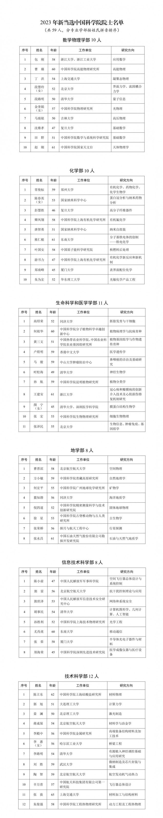 其中,數(shù)學物理學部10人,化學部10人,生命科學和醫(yī)學學部11人,地學部8人,信息技術科學部8人,技術科學部12人。新當選院士平均年齡54.7歲,最小年齡45歲,最大年齡65歲,60歲(含)以下的占90%。女性科學家有5人當選。院士隊伍的學科分布和年齡結構進一步優(yōu)化。本次增選后,現(xiàn)有中國科學院院士共873人。
