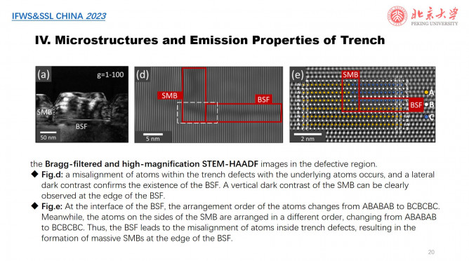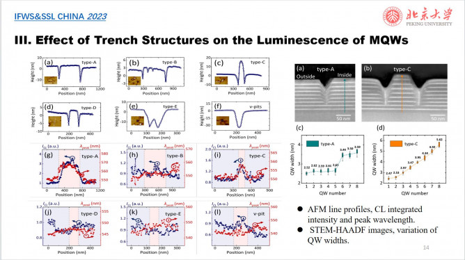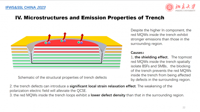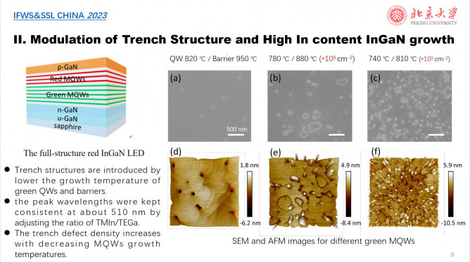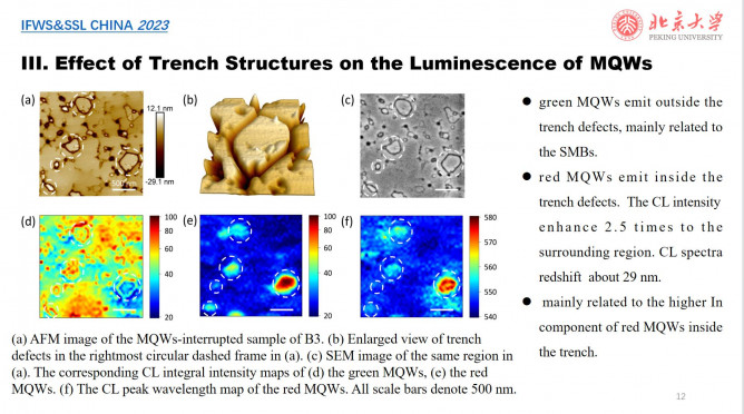 會(huì)上,北京大學(xué)教授陳志忠?guī)砹?ldquo;利用溝槽結(jié)構(gòu)生長高效率InGaN紅光”的主題報(bào)告,分享了溝槽結(jié)構(gòu)的調(diào)制與高In含量InGaN的生長、溝槽結(jié)構(gòu)對MQW發(fā)光的影響、溝槽的微觀結(jié)構(gòu)與發(fā)射特性等研究進(jìn)展與成果。