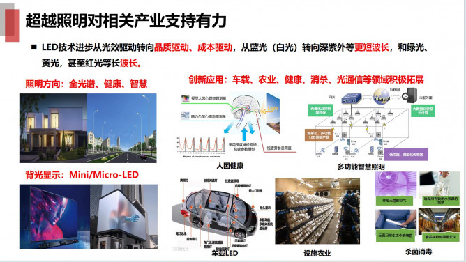 產(chǎn)業(yè)規(guī)??缭桨l(fā)展,成為全球最大生產(chǎn)、制造、出口國。節(jié)能減排成效顯著,20年間,我國LED照明產(chǎn)品累計節(jié)電量超過2.4萬億度,減少碳排放17.99億噸。LED照明已進入千家萬戶:從早期的指示顯示、背光、景觀等市場,進入到道路照明、工業(yè)照明、商業(yè)照明等領域,目前LED照明已全面進入家居照明市場。2023年LED照明產(chǎn)品銷量滲透率已經(jīng)接近90%,年節(jié)電量近3500億度;改變了照明的形態(tài):一體化燈具占比70%;家用智能照明市占率超過20%;LED照明銷量滲透率超過90%,在用量滲透率接近70%。并且推動了國際合作與交流,國際影響力顯著提升。超越照明對相關產(chǎn)業(yè)支持有力,LED技術進步從光效驅動轉向品質驅動、成本驅動,從藍光(白光)轉向深紫外等更短波長,和綠光、黃光,甚至紅光等長波長。