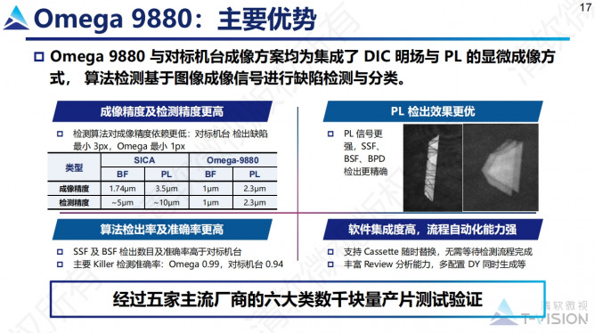 其Omega 9880是針對碳化硅襯底和外延的檢測設(shè)備。多配置DY預(yù)估結(jié)果同時輸出,使用直方圖、Wafer Map、Charts等形式對單次或批量檢測結(jié)果進行分析,數(shù)據(jù)庫存儲時間超過兩年,可隨時檢索。兼容主流廠商Mapping數(shù)據(jù)交換格式。檢測結(jié)果數(shù)據(jù)支持 FTP、HTTP、共享目錄等多種方式上傳,可合并不同功能檢測設(shè)備、不同產(chǎn)商檢測設(shè)備的 Mapping結(jié)果。報告指出,Omega 9880與對標(biāo)機臺成像方案均為集成了 DIC明場與PL的顯微成像方式,算法檢測基于圖像成像信號進行缺陷檢測與分類。