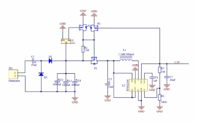 圖5: 基于單相發(fā)電機的免電池方案的電路原理圖,該方案可取代電池以解決設(shè)備更換電池的煩惱。