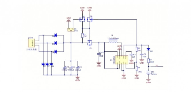 圖6 基于三相發(fā)電機的電池延長方案的電路原理圖,該方案可作為電池的補充以延長設(shè)備的續(xù)航時間。