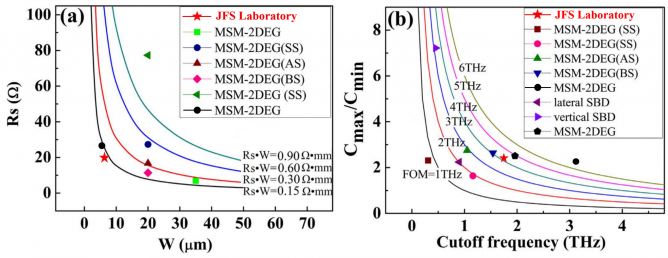 最終測試結(jié)果表明,該器件零偏時(shí)結(jié)電容最小僅為6fF,最大截止頻率超過1.5THz,處于國內(nèi)領(lǐng)先及國際先進(jìn)水平。