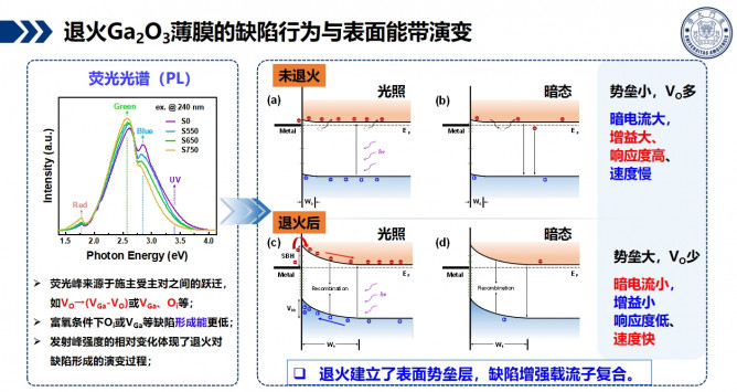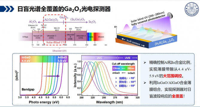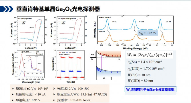 研究通過對外延薄膜后退火處理,獲得高響應(yīng)度、高探測率的日盲紫外光電探測器,實現(xiàn)對實際日盲信號的靈敏響應(yīng)。解釋了器件性能的大幅改善,是受到了由退火引起的缺陷以及表面狀態(tài)變化的共同影響。通過對Ga2O3進行Al/In合金化,實現(xiàn)了大范圍的帶隙調(diào)控,制備出了能夠響應(yīng)全日盲波段的紫外光電探測器,并解釋了合金組分的引入對能帶結(jié)構(gòu)的影響。依靠高質(zhì)量單晶制備了半透明Pt/Ga2O3垂直結(jié)構(gòu)肖特基光電二極管,該器件具有良好光電特性,通過調(diào)節(jié)界面耗盡層結(jié)區(qū)深度,成功實現(xiàn)無持續(xù)光電導(dǎo)的響應(yīng)速度。