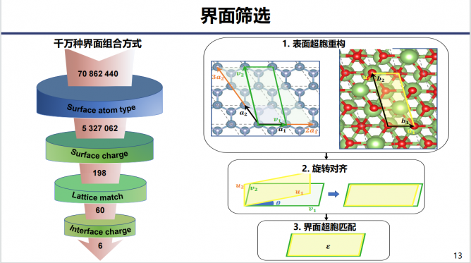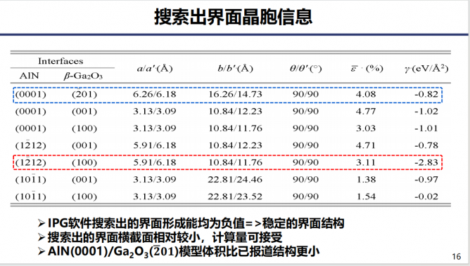 報告以β-Ga2O3 /AlN 界面為例,分享了高通量方法輔助篩選和預(yù)測半導(dǎo)體界面結(jié)構(gòu)的研究成果,涉及界面結(jié)構(gòu)預(yù)測、界面篩選、界面批量生成、界面穩(wěn)定性討論、能帶對齊等內(nèi)容。研究開發(fā)了半導(dǎo)體界面結(jié)構(gòu)高通量搜索軟件包(IPG),以Ga2O3 /AlN界面為例驗(yàn)證軟件功能,從70862440個構(gòu)型中,搜索出若干晶面的界面結(jié)構(gòu),電子結(jié)構(gòu)、能帶對齊分析與實(shí)驗(yàn)值吻合,IPG軟件包具有普適性(金屬/半導(dǎo)體界面、介質(zhì)/半導(dǎo)體界面), 為電子器件的高效設(shè)計提供了理論支撐,加速材料設(shè)計。