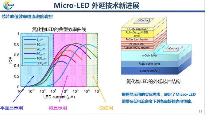 Micro-LED芯片關(guān)鍵問題涉及尺寸效應(yīng)和邊緣效應(yīng)導(dǎo)致的量子效率低,刻蝕工藝引入大量表面缺陷,造成側(cè)壁損傷,使芯片邊緣形成“死區(qū)”。Micro-LED顯示集成關(guān)鍵問題,涉及面向平板顯示的玻璃基巨量轉(zhuǎn)移及檢測修復(fù)和面向微型顯示的硅基CMOS集成技術(shù)問題。