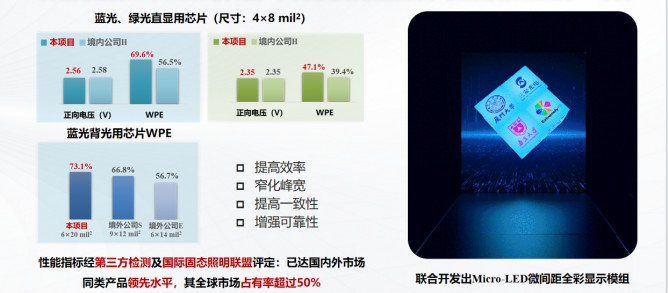 報告指出,研究實現(xiàn)高性能Micro-LED芯片量產(chǎn),突破全彩模組技術(shù),獲福建省科技進步一等獎。