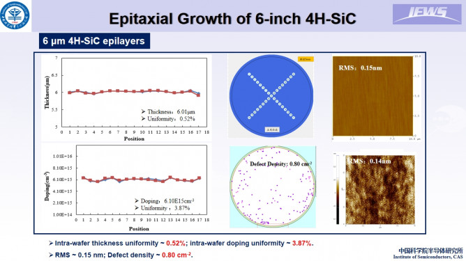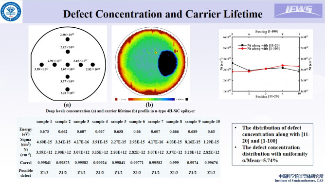 報告指出,對于6英寸4H-SiC的外延生長方面,用自制的熱壁LPCVD反應(yīng)器對直徑為150mm的4H-SiC Si面襯底進行了均勻外延生長。已經(jīng)實現(xiàn)了4H-SiC外延層的生長,厚度和摻雜均勻性分別為~0.5%和~3.5%。深能級晶圓研究方面,4H-SiC外延片的Z1/2缺陷分布均勻,缺陷密度與載流子壽命密切相關(guān)。深能級瞬態(tài)光譜(DLTS)是表征深能級的一種有效方法。