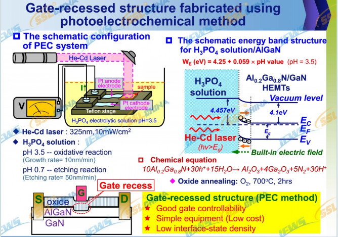 近日,第九屆國(guó)際第三代半導(dǎo)體論壇(IFWS)&第二十屆中國(guó)國(guó)際半導(dǎo)體照明論壇(SSLCHINA)于廈門召開。期間,“氮化鎵功率電子器件技術(shù)分論壇”上,臺(tái)灣元智大學(xué)前副校長(zhǎng)、臺(tái)灣成功大學(xué)特聘教授李清庭做了“GaN基單片電子器件的集成互補(bǔ)金屬氧化物半導(dǎo)體D模和E模高電子遷移率晶體管”的主題報(bào)告,分享了光電化學(xué)蝕刻法和氧化物法,D模和E模GaN基MOSHEMT的制備工藝,采用LiNbO3鐵電柵極氧化物層的D模和E模MOSHEMT集成的單片反相器,采用LiNbO3/HfO2/Al2O3鐵電電荷陷阱柵堆疊結(jié)構(gòu)的D模和E模MOSHEMT集成的單片反相器等相關(guān)研究進(jìn)展。