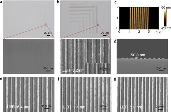 與此同時(shí),通過低劑量電子束光刻(10-40 μC cm-2)獲得線寬分辨率為45nm的密集圖形,展示了其應(yīng)用于高分辨率光刻的能力。接下來作者還對(duì)制備得到的基于點(diǎn)擊反應(yīng)的氧化鋯光刻膠的后加工性質(zhì)、抗刻蝕能力以及圖形轉(zhuǎn)移能力等進(jìn)行了初步研究。