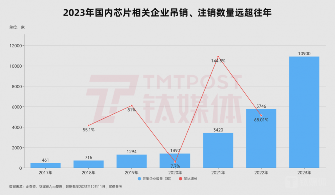 據(jù)鈦媒體報(bào)道,從企查查獲悉,2023年,中國(guó)已經(jīng)有1.09萬(wàn)家芯片相關(guān)企業(yè)注銷或吊銷,超過了2022年的5746家,同比暴增89.7%。這就意味著今年平均都有31家芯片企業(yè)消失。