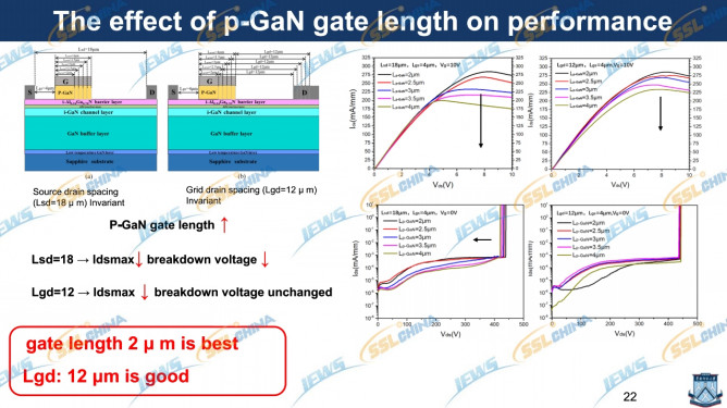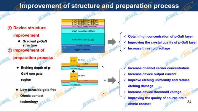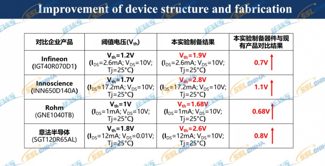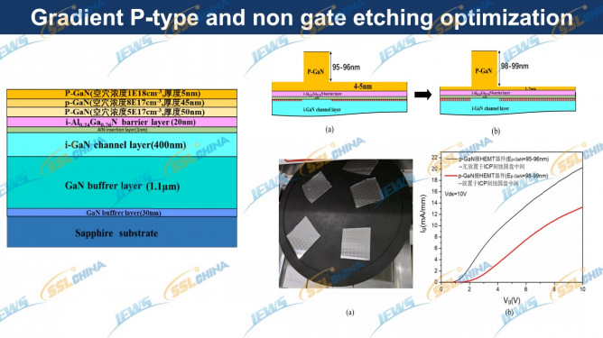 報告指出,結合 Mis結構、p柵極及階梯式的P型埋層可獲得:高Vth:4.14V,高BV:3065V 低RON:1.45mΩ·cm2, FOM :6.56GWcm-2。漸變p-GaN結構++優(yōu)化非p柵區(qū)的蝕刻深度++優(yōu)化源極-漏極蝕刻深度++最優(yōu)化p柵極長度++無金歐姆接觸:獲得Emode,高Vth:2.6V,p柵極長度為2μm。柵極和漏極之間的間距為12μm是最佳的。源極-漏極蝕刻深度為8-10nm。實現垂直HEMT器件的低成本低缺陷:EC直接剝離藍寶石襯底成為可能。