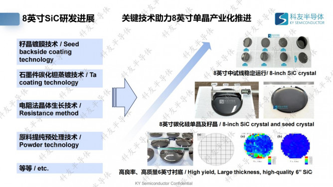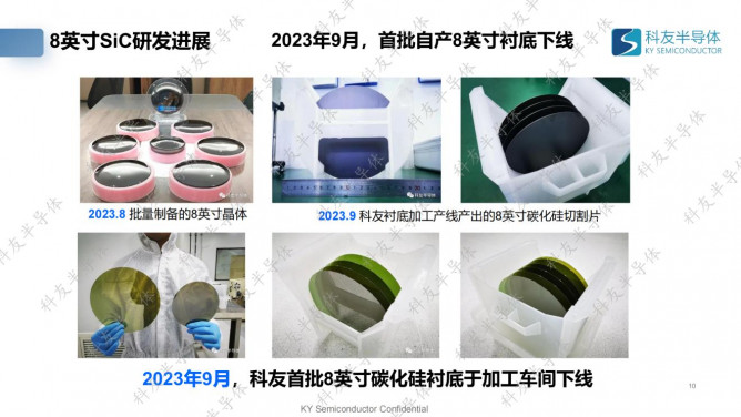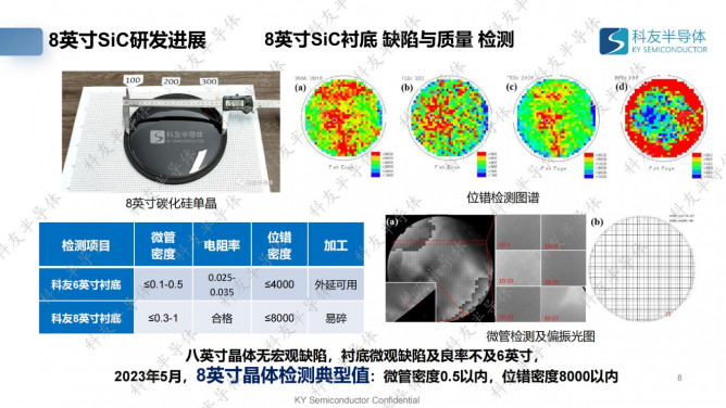 近年來,科友半導(dǎo)體在8英寸碳化硅襯底產(chǎn)業(yè)化研究方面取得較快進展。2022年11月,對外發(fā)布基于電阻爐的8英寸碳化硅,2023年2月,科友“8英寸碳化硅裝備及工藝”成果在中國電子學(xué)會組織的技術(shù)鑒定會上獲得高度評價,“指標(biāo)達到國內(nèi)領(lǐng)先、國際先進水平”,2023年4月,科友半導(dǎo)體8英寸碳化硅中試線正式貫通并進入小批量生產(chǎn)階段,2023年9月,襯底產(chǎn)線加工得到外延可用的8英寸碳化硅襯底,實現(xiàn)了大尺寸襯底加工技術(shù)的突破。目前,科友8英寸碳化硅長晶良率達到50%以上,厚度穩(wěn)定達到15-20mm,良率50%以上,總位錯2000-3000個/cm2左右。