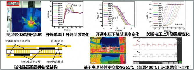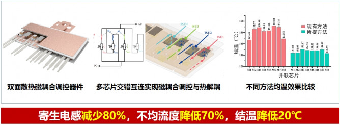 研究提出了磁耦合精確調(diào)控多芯片并聯(lián)電熱均衡方法,提出了控制磁場(chǎng)耦合度的多芯片電熱應(yīng)力調(diào)控方法,解決了多芯片不均衡性電熱應(yīng)力調(diào)控難題,為提高寬禁帶器件容量與可靠性建立了基礎(chǔ)。首次獲得了碳化硅半導(dǎo)體在550℃高溫的動(dòng)靜態(tài)特性,掌握了碳化硅極寬溫度范圍內(nèi)關(guān)鍵特征參數(shù)變化規(guī)律,并基于高溫器件實(shí)現(xiàn)了環(huán)境溫度265℃的高溫變換器。
