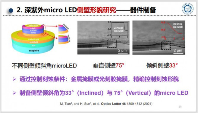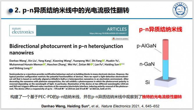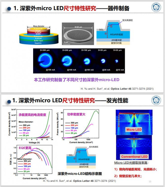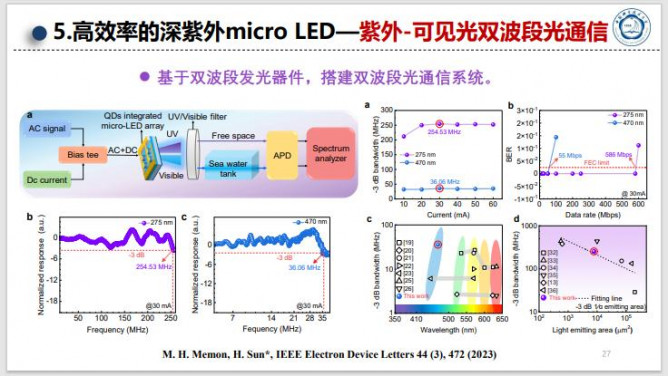 課題組通過(guò)實(shí)現(xiàn)對(duì)AlGaN薄膜和納米線(xiàn)結(jié)構(gòu)的可控外延生長(zhǎng)以及新穎的發(fā)光和探測(cè)器件結(jié)構(gòu)設(shè)計(jì)與制備,獲得器件的高效光電/電光轉(zhuǎn)換效率,并實(shí)現(xiàn)了在日盲紫外光通信中的應(yīng)用。報(bào)告總結(jié)了(1)通過(guò)制備microLED并優(yōu)化器件結(jié)構(gòu)和制備工藝(側(cè)壁鈍化工藝,幾何形貌和器件周長(zhǎng)比,器件尺寸大小及側(cè)壁斜切角,器件陣列等),提升紫外microLED的器件發(fā)光效率并體現(xiàn)出它們相較于傳統(tǒng)大尺寸器件在高速日盲紫外光通信中的應(yīng)用優(yōu)勢(shì);(2)利用AlGaN/GaN納米線(xiàn)比表面積大優(yōu)勢(shì)和納米線(xiàn)表面修飾和結(jié)構(gòu)優(yōu)化,實(shí)現(xiàn)雙極性光電流探測(cè),用于雙通道加密日盲紫外光通信等應(yīng)用等。