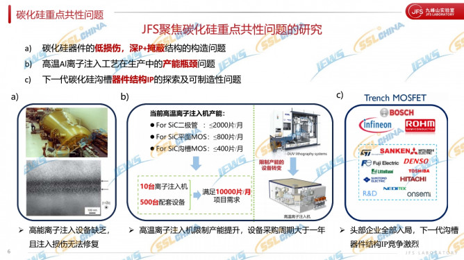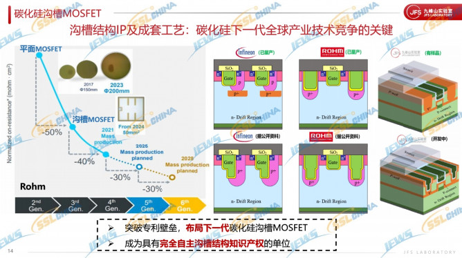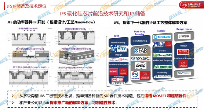 報告指出,九峰山實驗室聚焦碳化硅重點共性問題的研究,比如碳化硅器件的低損傷,深P+掩蔽結(jié)構(gòu)的構(gòu)造問題;高溫Al離子注入工藝在生產(chǎn)中的產(chǎn)能瓶頸問題;下一代碳化硅溝槽器件結(jié)構(gòu)IP的探索及可制造性問題。九峰山在碳化硅芯片前沿技術(shù)研究和 IP 儲備方面,從多級溝槽JBS二極管技術(shù)出發(fā),延申到各種新的SiC 器件技術(shù)構(gòu)造,包括溝槽MOSFET和超結(jié)器件;和產(chǎn)業(yè)公司及Fab探索推廣新的解決方案,可制造性技術(shù)。