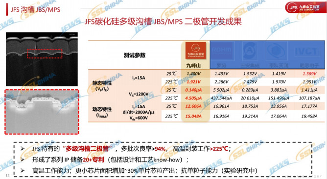 JFS多級溝槽二極管研究方面,涉及碳化硅多級溝槽JBS/MPS 二極管技術(shù)開發(fā),首次實現(xiàn)了“多級溝槽+低能量 P 注入”構(gòu)造超2um結(jié)深;開發(fā)出業(yè)界第一顆產(chǎn)品級的多級溝槽JBS二極管;解決了SiC溝槽器件中深 P 型掩蔽構(gòu)造時,刻蝕角度/深度/離子注入能量劑量與注入損傷之間的矛盾。碳化硅多級溝槽JBS/MPS二極管開發(fā)成果上,JFS特有的“多級溝槽二極管”,多批次良率>94%,高溫封裝工作>225℃;形成了系列IP儲備20+專利(包括設(shè)計和工藝know-how);高溫工作能力;更小芯片面積增加~30%單片芯粒產(chǎn)出;抗單粒子能力(實驗研究中)。