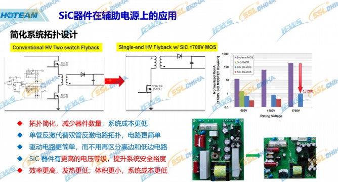 報(bào)告首先分享了SiC器件在電能質(zhì)量控制產(chǎn)品輔助電源上的應(yīng)用。采用Sic器件,可以有效簡(jiǎn)化電路拓?fù)?,減少器件數(shù)量。如功率電路采用單管反激代替雙管反激電路拓?fù)?,?qū)動(dòng)電路無需再區(qū)分高邊和低邊電路,大幅減少器件數(shù)量,簡(jiǎn)化電路拓?fù)?;由于SiC 器件具有更高的電壓等級(jí),因此可有效提升系統(tǒng)安全裕度;由于SiC器件的高速度、低損耗等特性,可使輔助電源效率更高、發(fā)熱量更少、體積更小、系統(tǒng)成本更低。