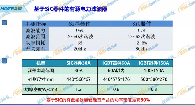 接下來,分享了基于SiC器件的有源電力濾波器、動(dòng)態(tài)電壓恢復(fù)器(DVR)和電能質(zhì)量?jī)?yōu)化與儲(chǔ)能一體化裝置三款產(chǎn)品。有源電力濾波器是電能質(zhì)量控制的關(guān)鍵產(chǎn)品,集諧波治理、無功補(bǔ)償、三相不平衡校正于一體。采用SiC器件后,其諧波濾除率、諧波濾除次數(shù)、整機(jī)損耗、輸出紋波、功率密度等各項(xiàng)指標(biāo)顯著提高,相比IGBT版本的產(chǎn)品,體積減少34.8%,率密度提高50%,下圖是基于IGBT和基于SiC器件的有源電力濾波器關(guān)鍵指標(biāo)對(duì)比;動(dòng)態(tài)電壓恢復(fù)器(DVR)是電壓閃變治理的關(guān)鍵產(chǎn)品,該產(chǎn)品采用全控型電力電子器件,當(dāng)系統(tǒng)電壓發(fā)生暫降或者暫升時(shí),DVR快速把超級(jí)電容存儲(chǔ)的電能逆變成交流電給設(shè)備供電,保證設(shè)備的連續(xù)運(yùn)行,不造成生產(chǎn)中斷,保障設(shè)備安全運(yùn)行?;赟iC器件與基于IGBT的DVR相比,具有更高的響應(yīng)速度、更低的損耗,其最快響應(yīng)時(shí)間可達(dá)1mS,可顯著降低電壓閃變對(duì)負(fù)載的影響。第三款產(chǎn)品為電能質(zhì)量?jī)?yōu)化與儲(chǔ)能一體化裝置,該產(chǎn)品將電能質(zhì)量?jī)?yōu)化與儲(chǔ)能相結(jié)合, 既能阻擋外網(wǎng)污染,又能防止負(fù)載污染電網(wǎng),并兼顧儲(chǔ)能,提高新能源發(fā)電消納能力,該產(chǎn)品采用諧振抑制專利技術(shù),可有效抑制光伏逆變器大量接入導(dǎo)致的諧振現(xiàn)象。采用SiC器件后,除可顯著提高產(chǎn)品的響應(yīng)速度、降低損耗、提高功率密度等優(yōu)點(diǎn)外,由于充分發(fā)揮了SiC器件的高速特性,進(jìn)一步提高了產(chǎn)品的諧振抑制能力,為高比例新能源電力系統(tǒng)安全穩(wěn)定運(yùn)行保駕護(hù)航。