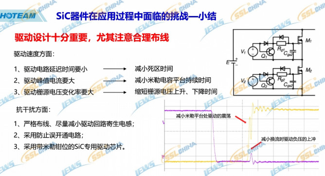 SiC器件具有高開關(guān)頻率、高耐壓、耐高溫、低損耗等諸多優(yōu)勢(shì),但在SiC器件應(yīng)用方面,仍然面臨諸多挑戰(zhàn):如何避免米勒電容引起的寄生導(dǎo)通效應(yīng);如何進(jìn)一步提高開關(guān)頻率,降低開關(guān)與導(dǎo)通損耗;如何準(zhǔn)確的測(cè)量柵源電壓驅(qū)動(dòng)波形;如何可靠的保護(hù)等等。報(bào)告對(duì)這些問題進(jìn)行了剖析,并提出來相應(yīng)的解決方案,報(bào)告特別強(qiáng)調(diào),SiC器件的應(yīng)用,驅(qū)動(dòng)設(shè)計(jì)十分重要,尤其應(yīng)注意合理布線。報(bào)告最后對(duì)SiC的應(yīng)用進(jìn)行了展望,除以上三款產(chǎn)品外,公司也在試驗(yàn)電源、新能源汽車逆變器進(jìn)行了SiC器件應(yīng)用的探索。報(bào)告指出,預(yù)計(jì)在未來幾年,隨著技術(shù)的進(jìn)步和成本的降低,SIC的市場(chǎng)份額和應(yīng)用范圍都將大幅度擴(kuò)展。