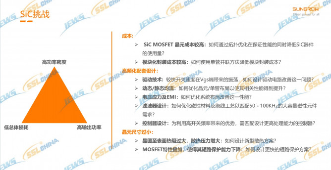 近日,第九屆國(guó)際第三代半導(dǎo)體論壇(IFWS)&第二十屆中國(guó)國(guó)際半導(dǎo)體照明論壇(SSLCHINA)于廈門召開。期間,”功率模塊與電源應(yīng)用峰會(huì)“上,陽(yáng)光電源高級(jí)工程師,中央研究院光儲(chǔ)中小功率業(yè)務(wù)主管王昊做了”碳化硅功率器件在新能源領(lǐng)域的應(yīng)用和挑戰(zhàn)“的主題報(bào)告,分享了SiC器件在新能源行業(yè)應(yīng)用的機(jī)遇、挑戰(zhàn),以及SiC器件在陽(yáng)光電源應(yīng)用的實(shí)踐等內(nèi)容。