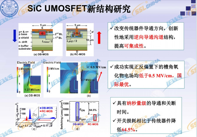 SiC UMOSFET新結(jié)構(gòu)研究方面,涉及改變傳統(tǒng)器件導(dǎo)通方向,創(chuàng)新性地采用逆向?qū)系澜Y(jié)構(gòu),提高可集成性。成功實(shí)現(xiàn)正反偏置下的主溝槽槽角氧化物電場(chǎng)均低于0.5 MV/cm,國(guó)際領(lǐng)先。具有納秒量級(jí)的導(dǎo)通和關(guān)斷時(shí)間。開關(guān)損耗相比于傳統(tǒng)器件降低64.5%等。報(bào)告中分享了半超結(jié)溝槽MOSFET的設(shè)計(jì)、埋層超結(jié)溝槽MOSFET的設(shè)計(jì)等。