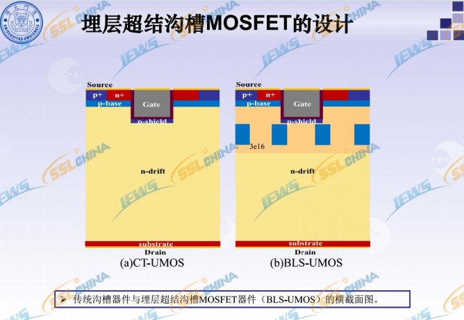 埋層超結(jié)溝槽MOSFET的設(shè)計(jì)研究顯示,轉(zhuǎn)移、輸出特性方面,電流傳輸層使器件反型層溝道加快形成,降低了器件的閾值電壓。傳輸層使器件的電流密度增大,使比導(dǎo)通電阻下降35%。電流密度方面,CT-UMOS的飽和電流密度為2.7e5 A/cm2,BLS-UMOS的飽和電流密度為5.1e5 A/cm2。高摻雜的N傳輸層能夠更高的電流密度。擊穿特性與電場(chǎng)強(qiáng)度方面,P埋層的耗盡使BLS-UMOS的耐壓能力提升40%,同時(shí)改善了器件柵極氧化層的可靠性。米勒電容(電荷)方面,BLS-UMOS埋層與傳輸層耗盡產(chǎn)生的屏蔽作用,使米勒電容下降40%,米勒電荷下降26%。