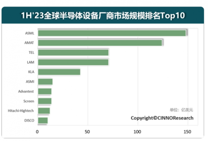 2023年上半年,全球半導體設備廠商市場規(guī)模排名出現(xiàn)調(diào)整。ASML以超148億美元的營收躍至榜首,應用材料憑借124億美元的營收緊跟其后,東京電子也反超泛林奪得第三名,科磊則依舊名列第五。